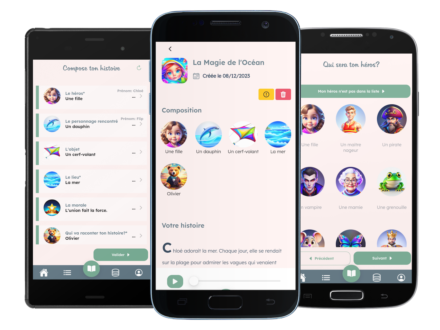 L'application permet aux parents et à leurs enfants de composer et d'écouter des histoires personnalisées à l'aide d'éléments qui rendront l'aventure unique : le héros, le personnage rencontré, l'objet spécial, le lieu, la morale, la durée, le narrateur, etc.