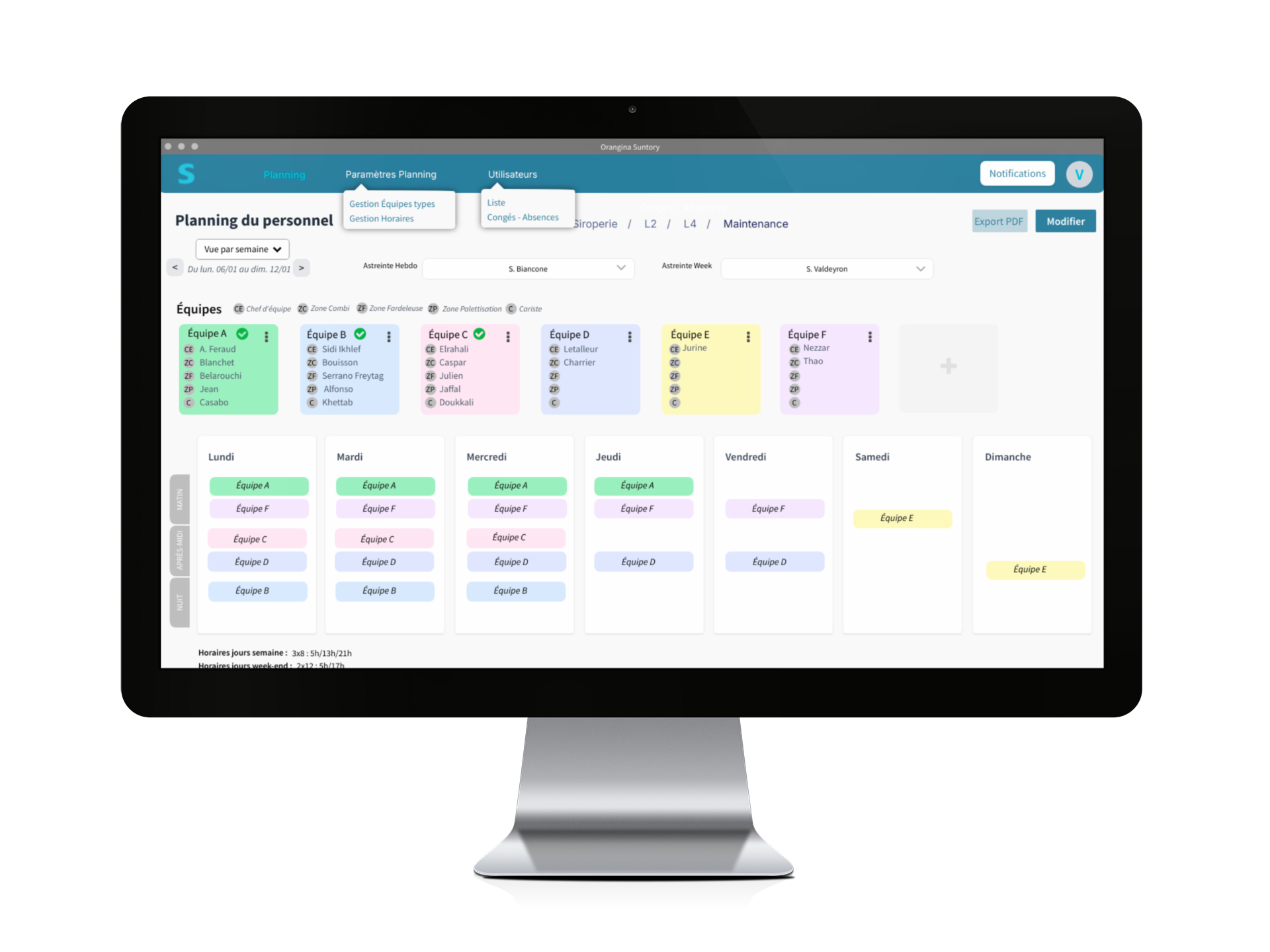 - un écran principal de planning avec affichage par équipe et par poste, codé par couleur pour un suivi hebdomadaire clair,