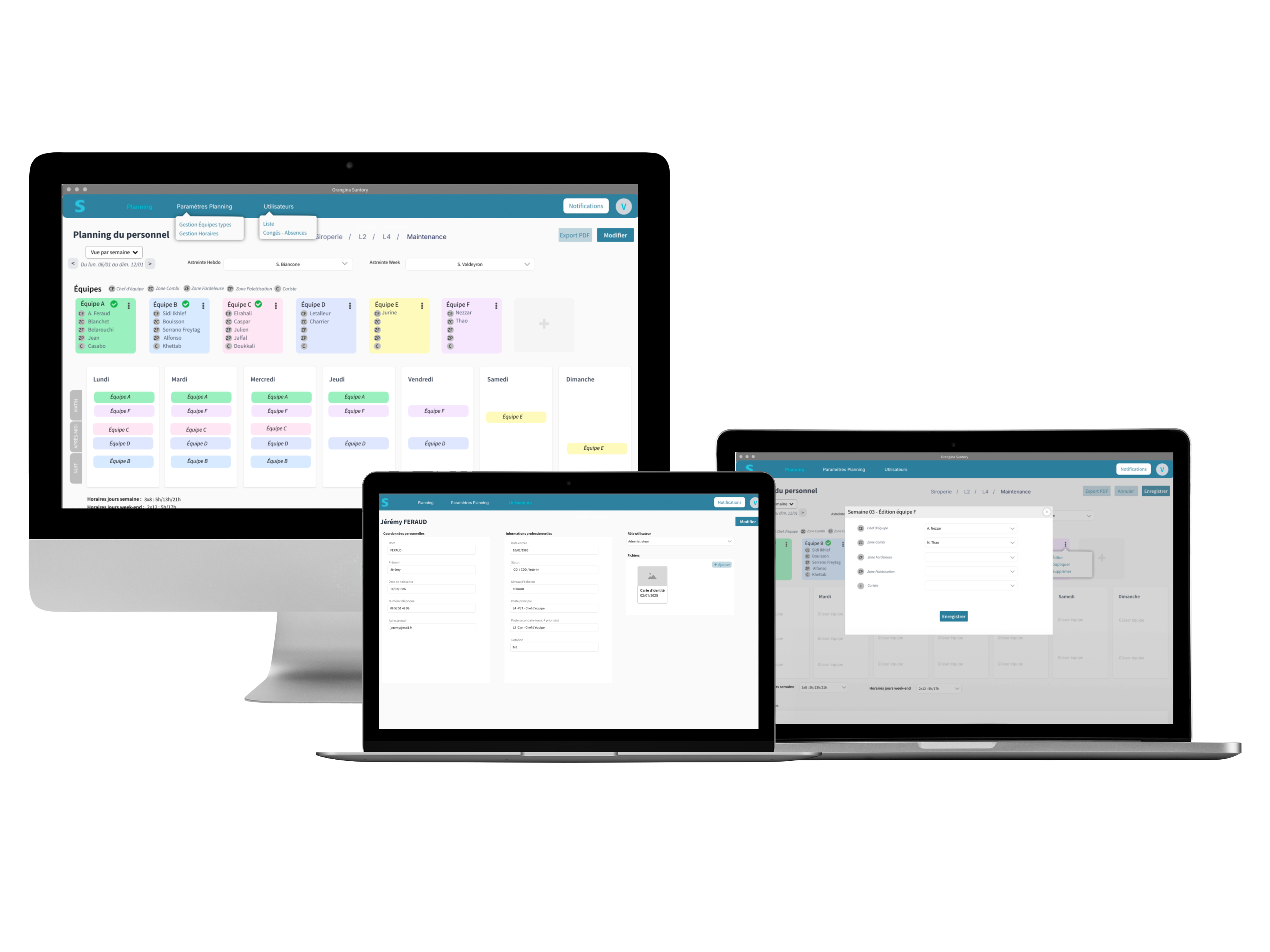 Le socle applicatif intègre la gestion complète des utilisateurs et des équipes (postes principaux ou secondaires, contrats, rotations). L’interface de planification, pensée pour être simple et visuelle, permet d’affecter les collaborateurs par équipe et de gérer les remplacements en quelques clics grâce au glisser-déposer.