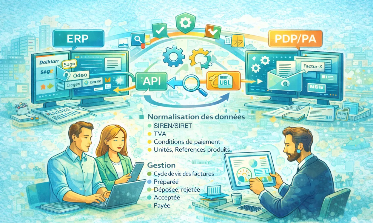 - Connecteurs / API entre ERP (exemple : Dolibarr, Sage, Cegid, Odoo, solutions métiers) et plateformes (PDP/PA)